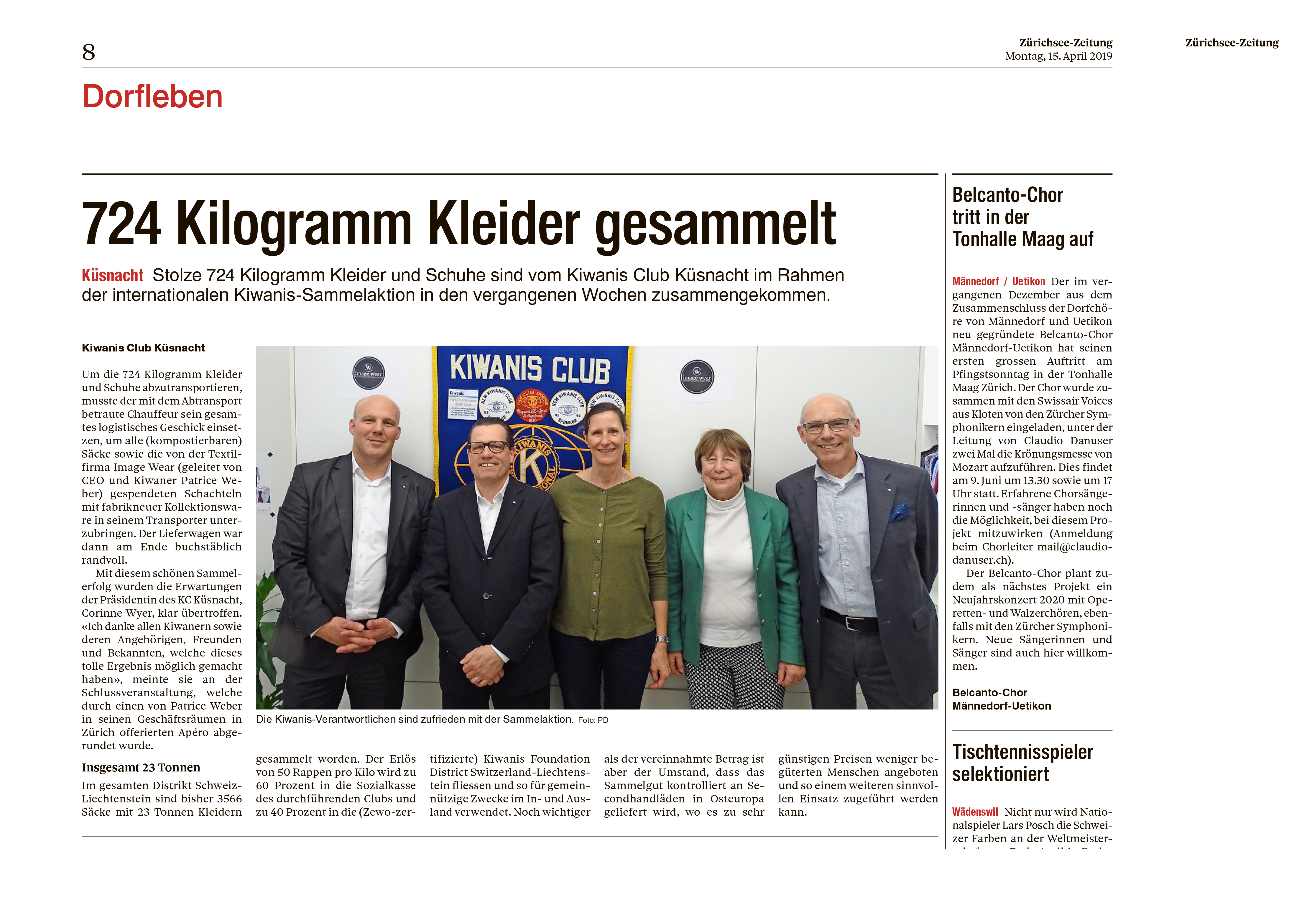 Im gesamten Distrikt Schweiz-Liechtenstein sind bisher 3566 Säcke mit 23 Tonnen Kleidern gesammelt worden. Der Erlös von 50 Rappen pro Kilo wird zu 60 Prozent in die Sozialkasse des durchführenden Clubs und zu 40 Prozent in die (Zewo-zertifizierte) Kiwanis Foundation District Switzerland-Liechtenstein fliessen und so für gemeinnützige Zwecke im In- und Ausland verwendet. Noch wichtiger als der vereinnahmte Betrag ist aber der Umstand, dass das Sammelgut kontrolliert an Secondhandläden in Osteuropa geliefert wird, wo es zu sehr günstigen Preisen weniger begüterten Menschen angeboten und so einem weiteren sinnvollen Einsatz zugeführt werden kann.